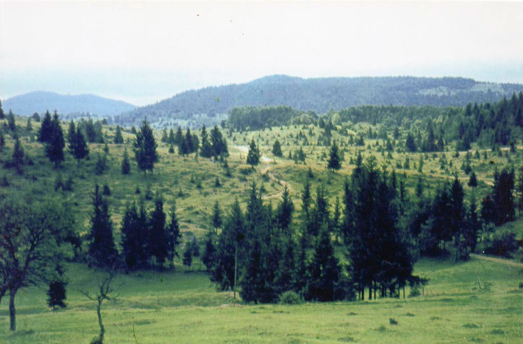 Zadaj na levi strani je s smrekami obdan del Vedkovega grunta. Hribovje v ozadju na levi strani je hrvaško, na desni pa slovensko z najvišjim vrhom Gredl.