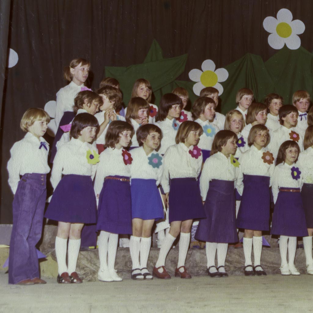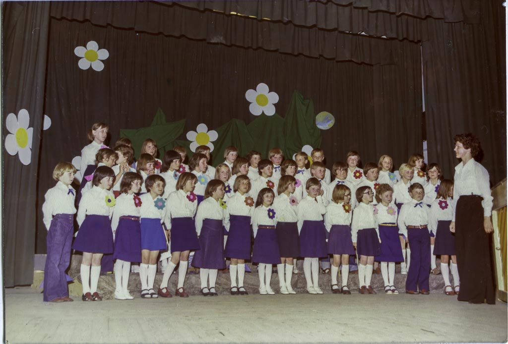 Otroški pevski zbor osnovne šole Rakek, v šolskem letu 1976/77, z zborovodkinjo Danico Devinar, poročeno Štefančič. Pevski zbor so sestavljali učenci od prvega do četrtega razreda.