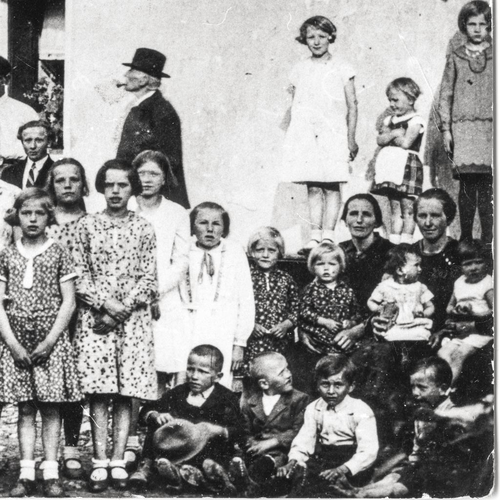 - Prvi z leve je Alojz Štenta, ki je postal učitelj, Andrej Funda – čevljar, Ivan Jenc je odšel v Avstralijo in tam tudi umrl, za njim je Kovačev Matija, četrti z leve je Brinarjev Janko, poleg njega Tilka Drobnič – Gornikova, med Jankom in Tilko je Pepca Hribar, Janezova sestra, Micka Hrbljan pestuje brata Toneta, pred njo stoji sestrica Pepca, za njo stoji Rezi Mulec – Korenova, skrajno desno zgoraj je Janez Hribar, oče Marije Hribar.