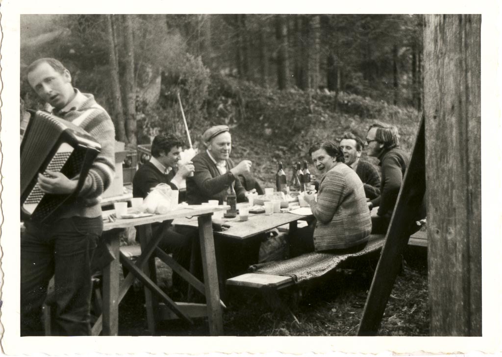 No in tako se je razvilo pravo vzdušje! Jože Kovač iz Podcerkve je raztegnil meh, strokovnjaki smo posedali za mizo in se gnetli okoli žara. Poleg mene sedi na levi strani Vili Šumrada iz Pudoba, pokrit s čepico, ki je prisegal na Alžirca, na desni strani pa veselo družbo ustvarjajo Vilijeva žena Ančka, Tone Modic iz Vel. Blok (z očali) in Tone Plos iz Loža, takrat najbrž že direktor TOZD Okovje. Okrasje na mizi in veselje prisotnih kaže, da je bil piknik že v polnem teku.