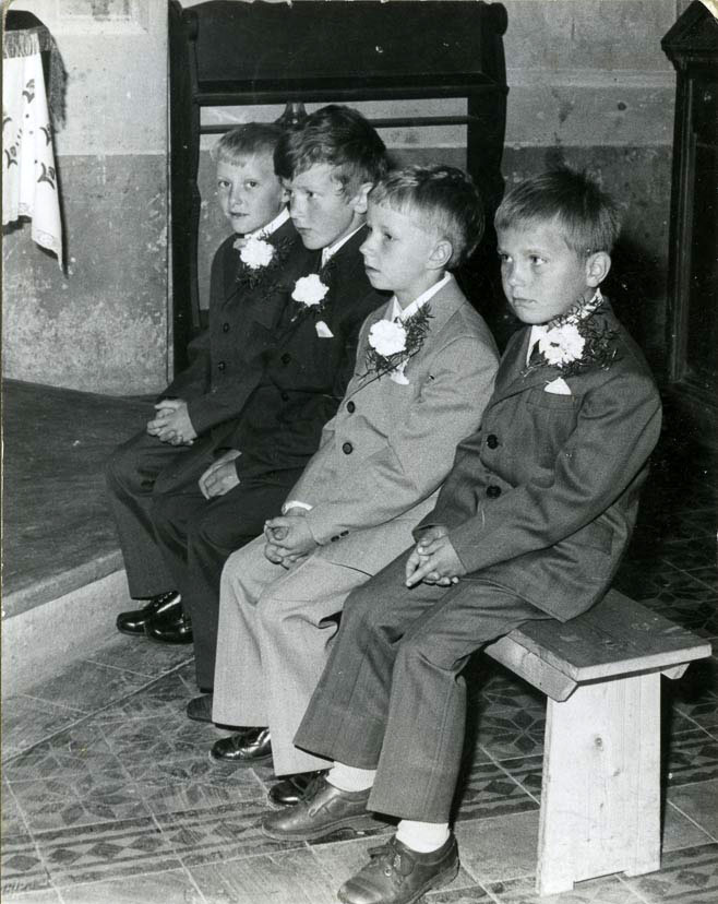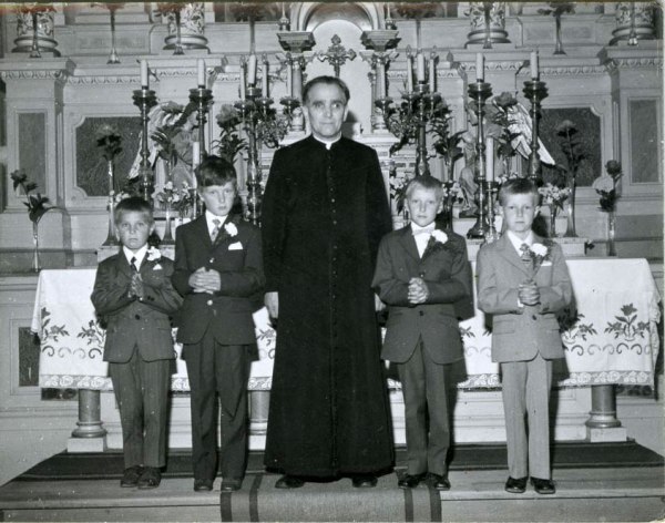 Štirje prvoobhajanci in župnik Andrej Makovec, slikani pred glavnim oltarjem v cerkvi pri Sveti Trojici: Ludvik Mramor (Ulaka), Metod Kraševec (Jeršanovo) g. župnik Andrej Makovec, Bojan Korošec (Hiteno) in Dušan Klančar (Zales).