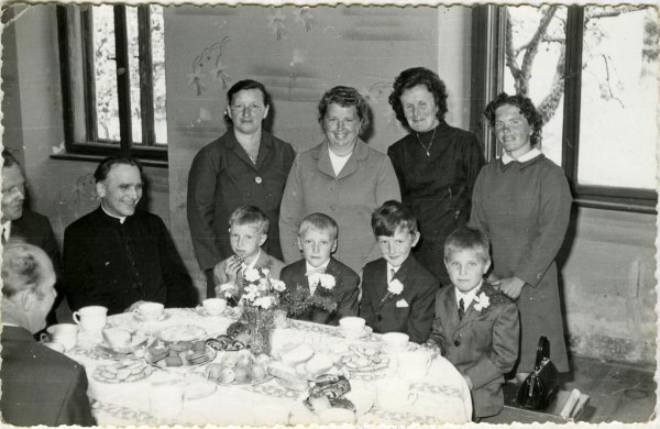 Po obhajilu so odšli prvoobhajanci z župnikom in starši v farovž poleg cerkve. Tam jih je čakala pogostitev, ki jo je pripravila gospa Fanika Zurcova, ki je živela tam v bližini. Čaj, piškoti, potica in sadje. Bilo je skromno, vendar lepo in srčno. Starši prvoobhajancev so morali v tistih časih kar lep čas šparati, da so lahko kupili obleke za svoje otroke.