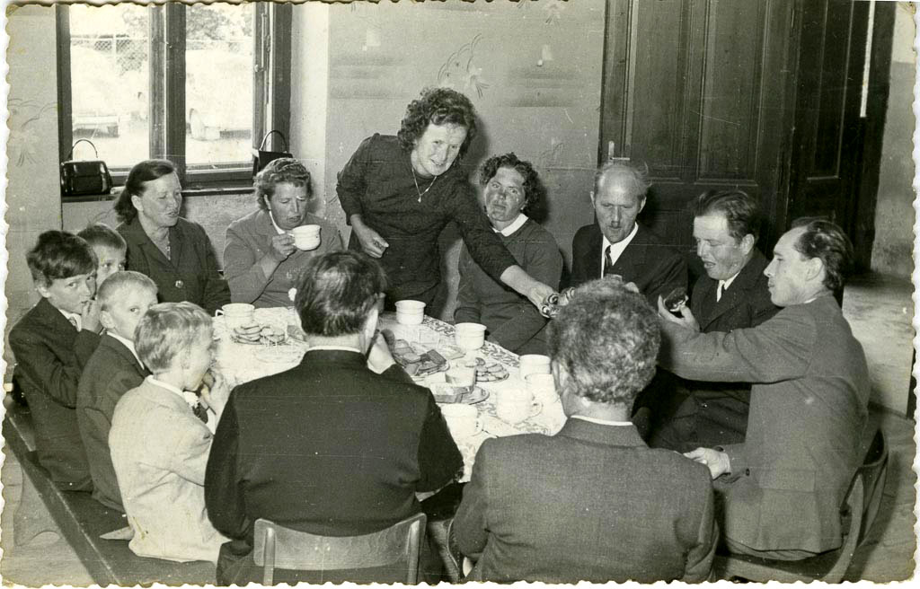Tu pa je prikazano celotno omizje. Na okenski polici sta odloženi dve ženski torbici. Ob levi strani uživajo v pogostitvi vsi štirje prvoobhajanci. Prva zgoraj je Marija Klančar iz Zalesa. Poleg nje sedi s skodelico čaja v roki Milka Korošec. Potico je pravkar postregla Ljudmila Kraševec. Nato sta Anica in njen mož Alojz Mramor. Sledi oče Bojana Korošca in nato povabljeni organist Milan Žnidaršič iz Malnov – Malenski. V hrbet vidimo očeta Metoda Kraševec in kot zadnji še g. župnik. Dušanov oče je bil tedaj žal že pokojni.