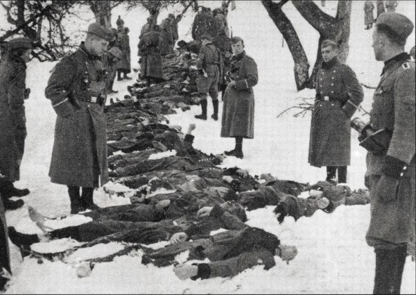 Nemški policisti si ogledujejo pobite “kamerade” – nemške policiste, Rovte v Selški dolini, 12. december 1941. (Fotoatelje Julijane Šelhaus v Škofji Loki).