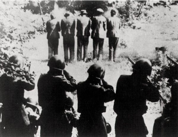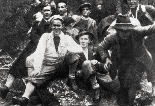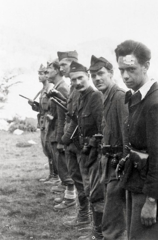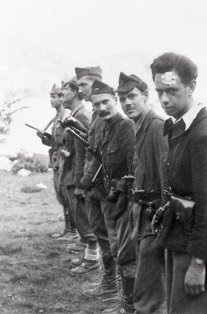 Skupina partizanov na Krimu avgusta 1941. Ena prvih fotografij partizanov neznanega avtorja. Bili so v takratni značilni pohodniški oziroma planinski odpravi. Tudi načela konspirativnosti niso upoštevali, ki je bilo za prve partizanske enote zelo pomembno.