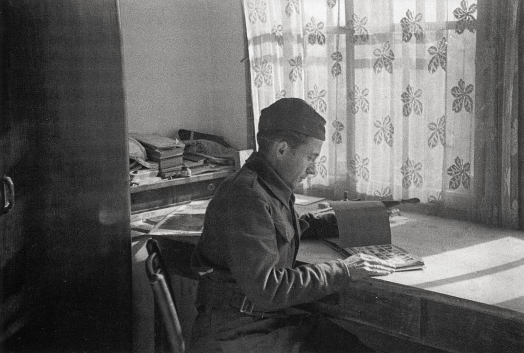 Franjo Veselko pregleduje albume s fotografijami, Črnomelj 22. oktobra 1944, foto Maksimilijan Zupančič.