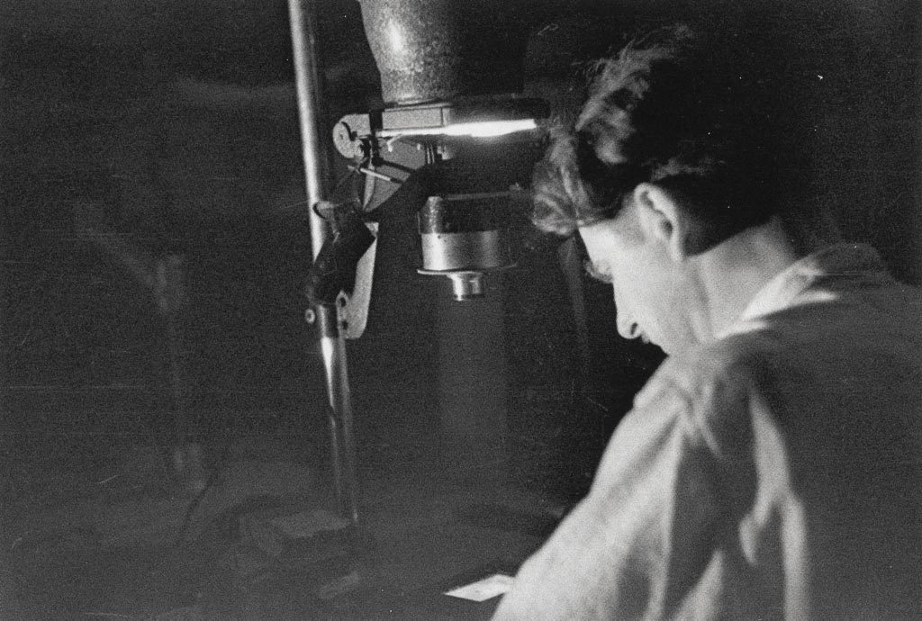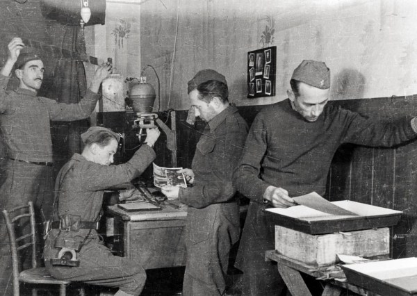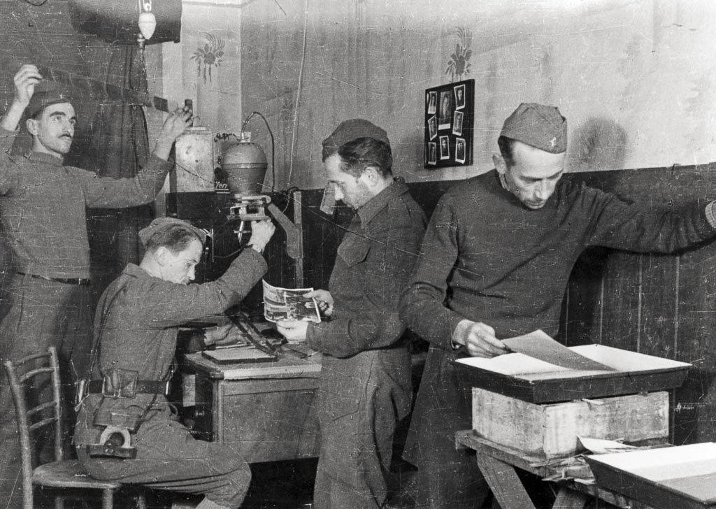 Rudi Vaupotič pri povečevanju fotografij, Fotosekcija GŠS 28. marca 1945. Foto France Cerar.