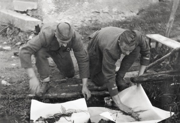 Levo Ciril Brvar in Jože Petek izpirata fotografske povečave za razstavo o pohodu 14. divizije na Štajersko v Gornjem Gradu kar v potoku, 1944. (Muzej narodne osvoboditve Maribor.)