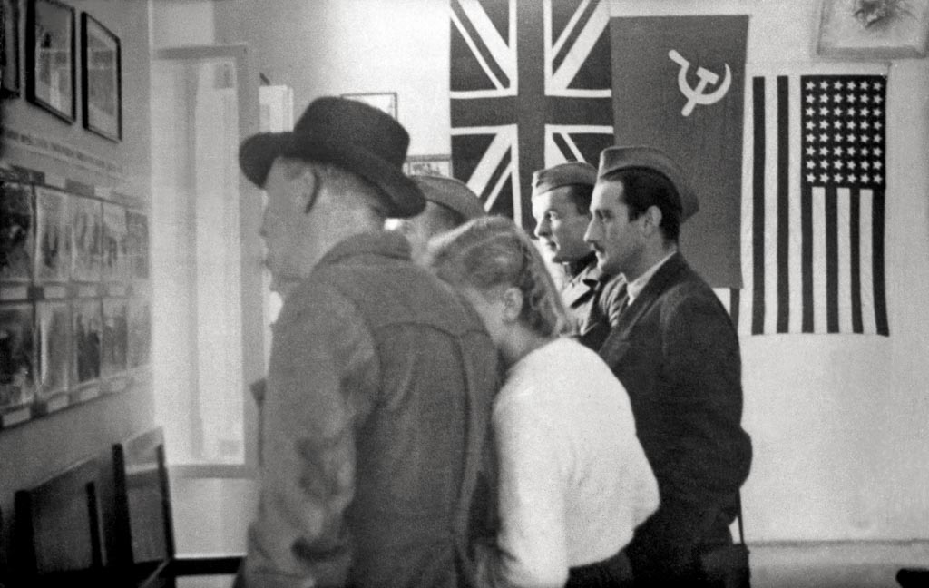 Borci si ogledujejo potujočo fotografsko razstavo, Suha krajina marca 1945, foto Milan Štok.