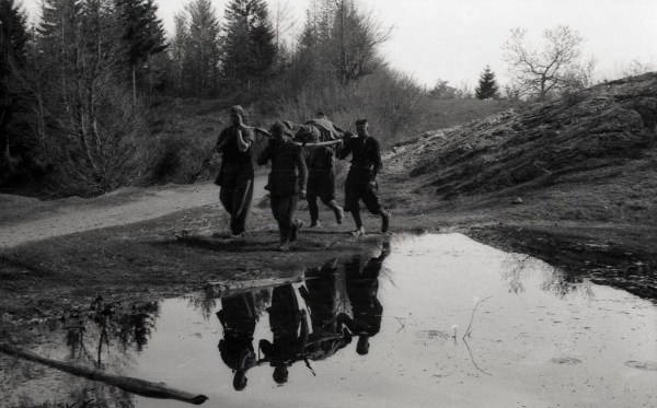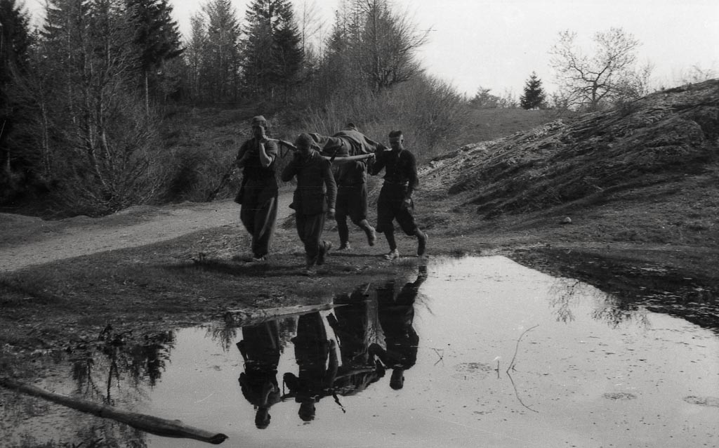 Prenos ranjenca v bolnišnice v Kočevskem rogu, pomladi 1944, foto Janez Milčinski.