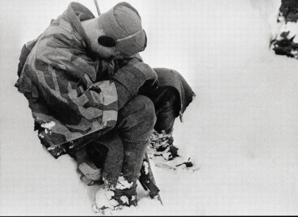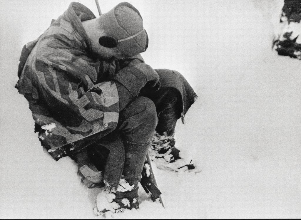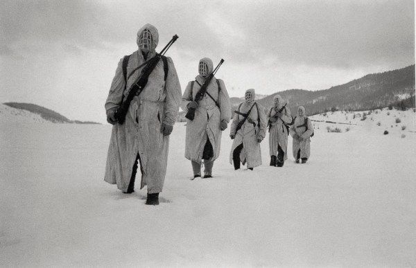 Belo maskirana partizanska izvidnica v snegu nekje pod Snežnikom, pozimi 1944/45, foto Edi Šelhaus.