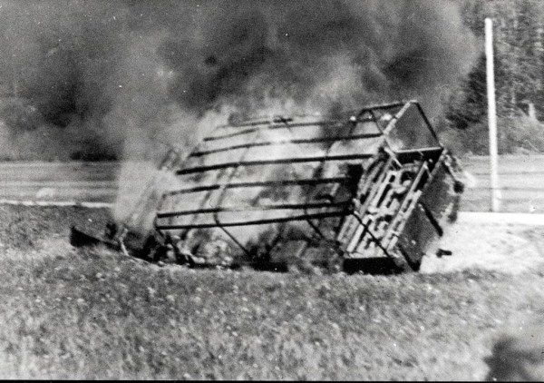 Goreči nemški tovornjak po napadu borcev Šlandrove brigade pri Trnjavi na cesti med Lukovico in Krašnjo, 27. april 1944, foto Stane Lenardič.
