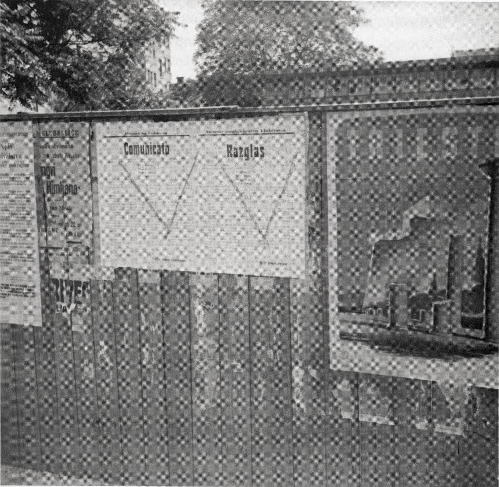 Uradni razglas na katerega je nekdo napisal črko V, Ljubljana, julija 1941, foto Miran Pavlin.