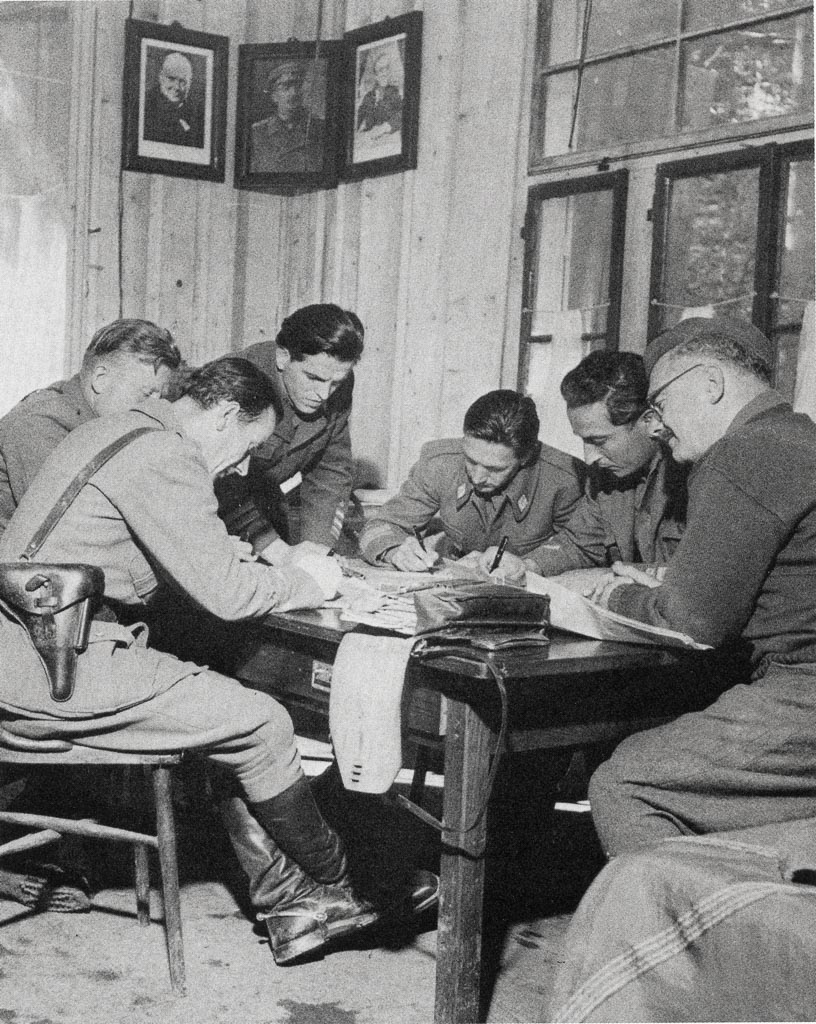 John Philips: Načrtovanje napada na litijski most v GŠ slovenske partizanske vojske. Pri mizi stoji komandant general Franc Rozman – Stane. Po načrtu naj bi poslali tri brigade v Litijo, kjer naj bi sodelovanju z zavezniškim letalstvom napadle nemško garnizijo in razstrelile železniški most. Na steni so portreti Churchilla, Stalina in Roosevelta, september 1944.