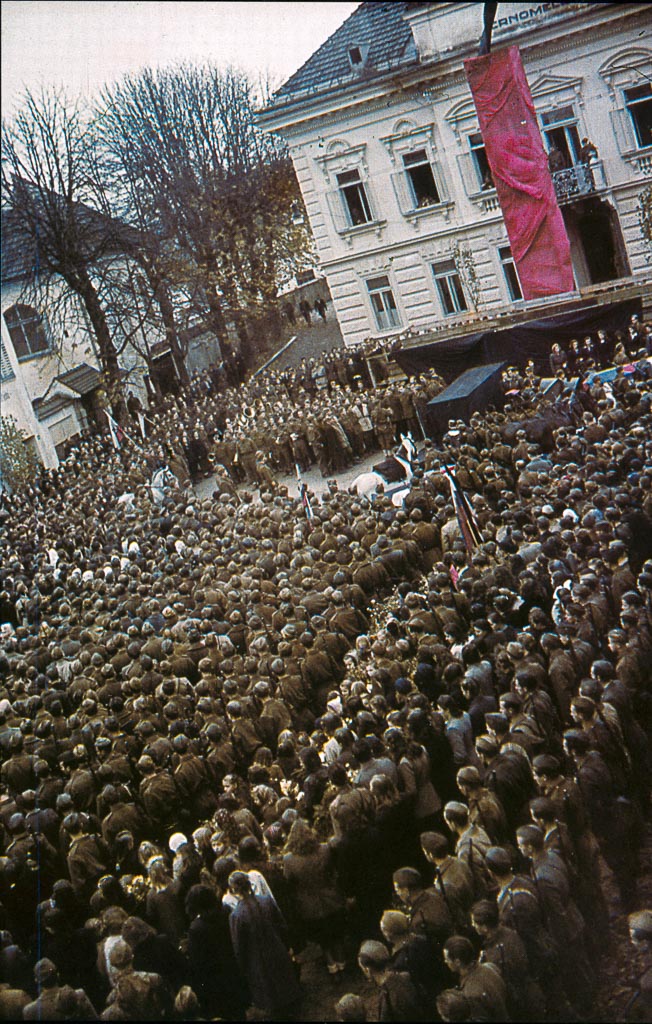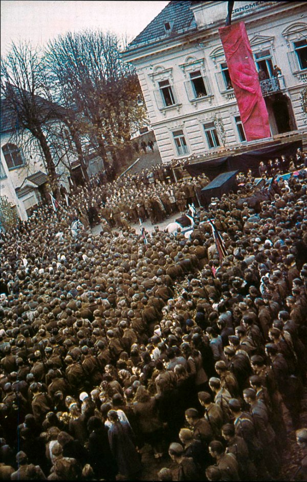 Pogreb priljubljenega partizanskega komandanta Franca Rozmana – Staneta, Črnomelj novembra 1944, foto Čoro Škodlar. Barvni diapozitiv Stanetovega pogreba je glede na vojne razmere izjemen in hkrati višek tehničnega razvoja partizanskih fotografskih posnetkov.