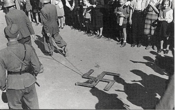 Sredi poletja 1941 so se začeli pojavljati očitni izrazi odpora proti okupatorju med njimi zlasti različni napisi. Na posnetku je znak V (Victory – zmaga) napisan pri stranskem vhodu v frančiškansko cerkev na Miklošičevi ulici v Ljubljani 13. julija 1941, foto Jakob Prešeren.