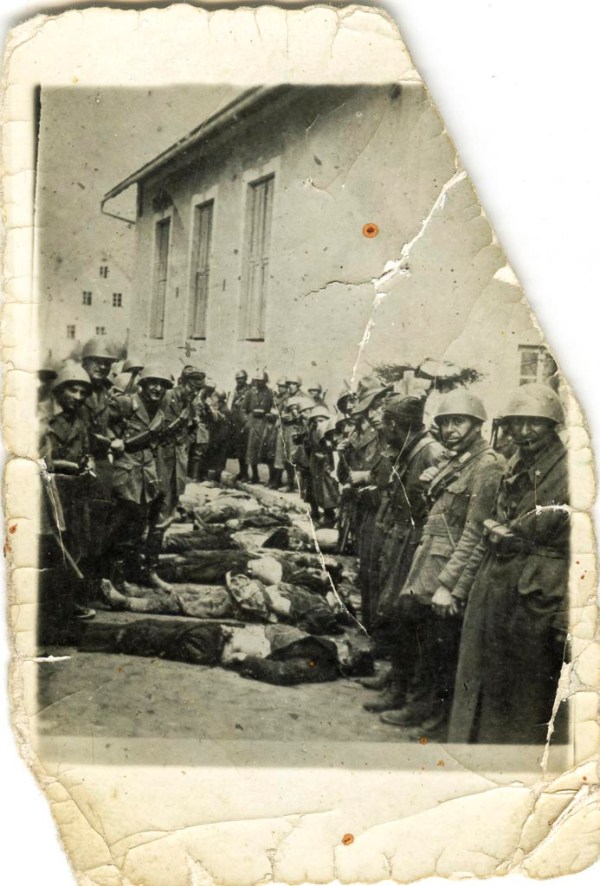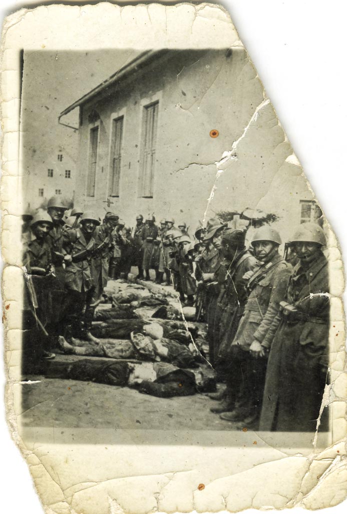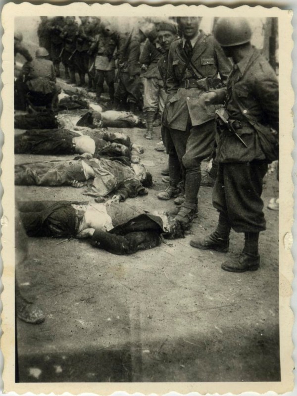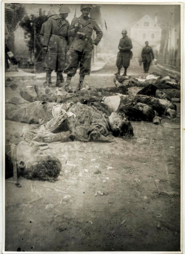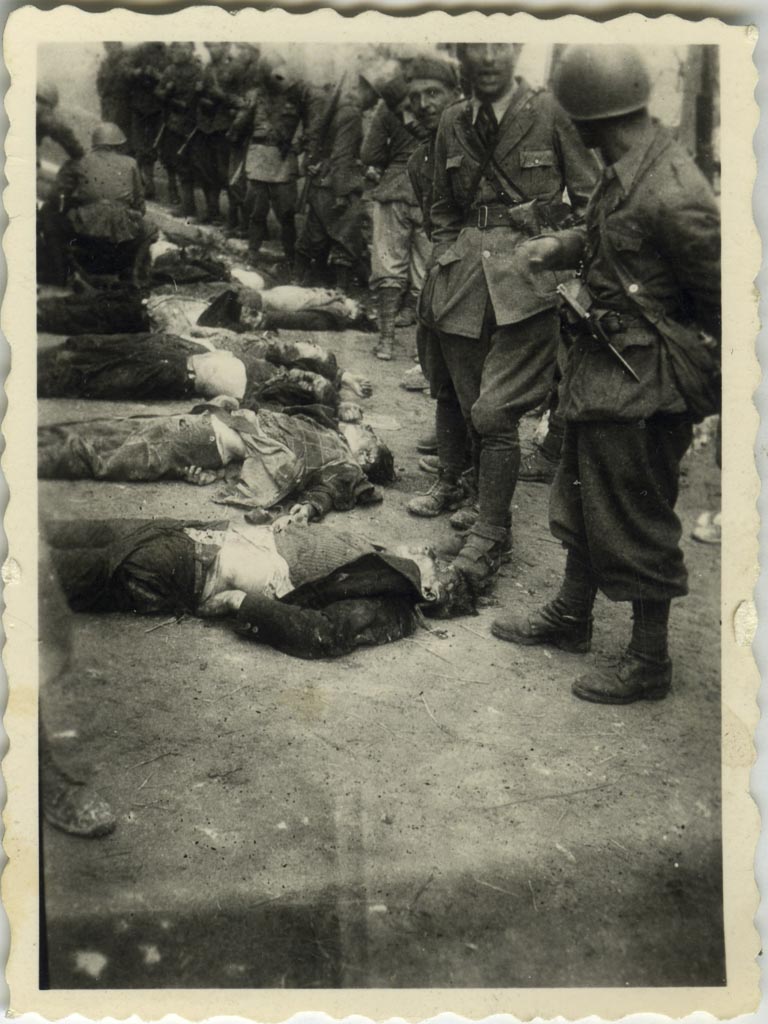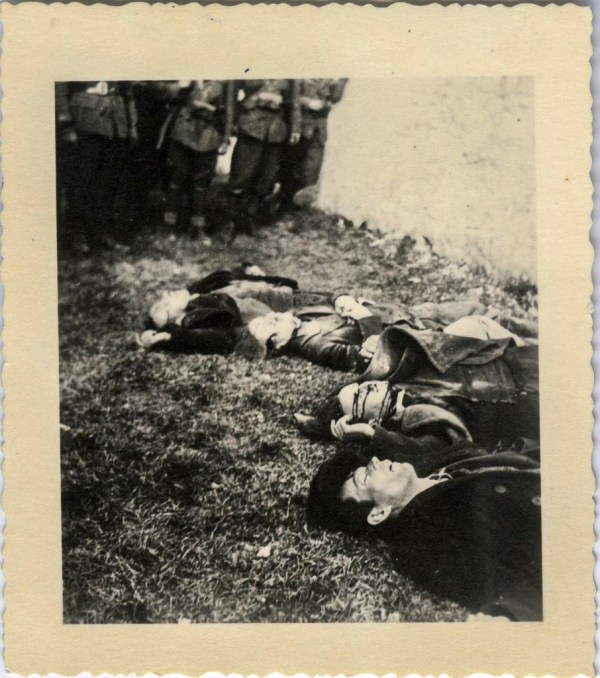Strašen pogled. Na sliki so ubiti člani NZ ob zmagoslavni pozi in smehljaju italijanskega vojaka v Starem trgu pred Sokolskim domom, kamor so pripeljali padle.