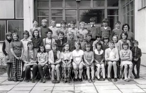 Razredničarka Milka Manfreda in njen 4. b razred, slikan pred vhodom v osnovno šolo Cerknica, v šolskem letu 1974/75. Z njimi je slikan tudi njen sinček Aleš, ki je bil večkrat pri njih tudi med poukom. Razred je povezovalo pristno prijateljstvo. Nikoli ni bilo čutiti razlik med kmečkimi in meščanskimi otroci.
